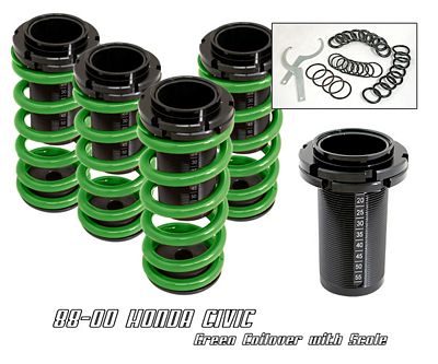 This Honda Civic Coilovers will fit 1988, 1989, 1990, 1991, 1992, 1993, 1994, 1995, 1996, 1997, 1998, 1999, 2000 Honda Civic. Replace or upgrade your Honda Civic Coilovers with our Honda Civic 1988-2000 Green Coilovers Lowering Springs Kit with Scale.