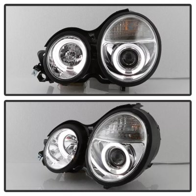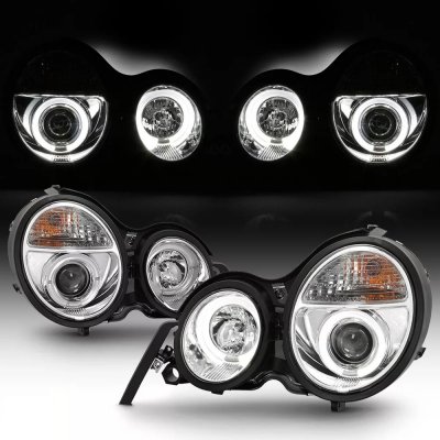 This Mercedes Benz E Class Projector Headlights will fit 1996, 1997, 1998, 1999 Mercedes Benz E Class. Mercedes Benz E Class 1996-1999 Clear Dual Halo Projector Headlights also features Chrome Housing Clear lens, Stylish Angel Eyes Design, Dual Halo, Low Beam H7, High Beam H1. Replace or upgrade your Mercedes Benz E Class Projector Headlights with our Mercedes Benz E Class 1996-1999 Clear Dual Halo Projector Headlights.