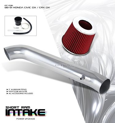 This Honda Civic Short Ram Intake will fit 1988, 1989, 1990, 1991 Honda Civic. Honda Civic DX 1988-1991 Polished Short Ram Intake System also features Aluminum Piping,High Flow Air Filter,All Accessories Included. Replace or upgrade your Honda Civic Short Ram Intake with our Honda Civic DX 1988-1991 Polished Short Ram Intake System.