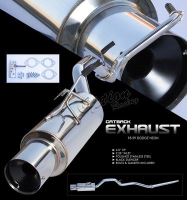 This Dodge Neon Cat Back Exhaust System will fit 1995, 1996, 1997, 1998, 1999 Dodge Neon. Dodge Neon 1995-1999 Cat Back Exhaust System also features 2.25 inches Inlet,4.5 inches Tip Outlet.Polished Stainless Steel,Black Silencer,Bolts and Gaskets Included. Replace or upgrade your Dodge Neon Cat Back Exhaust System with our Dodge Neon 1995-1999 Cat Back Exhaust System.