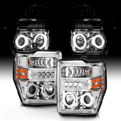 This Ford F250 Projector Headlights will fit 2008, 2009, 2010 Ford F250. Ford F250 Super Duty 2008-2010 Clear Projector Headlights with Halo and LED also features Diamond Cut Angel Eyes Design, Lower Power Consumption and Longer Lifetime, Dual Halo Rings, Ultra Bright Style LED, Quality Chrome Plated Housing, Amber Reflector, Low Beam H7, High Beam H1. Replace or upgrade your Ford F250 Projector Headlights with our Ford F250 Super Duty 2008-2010 Clear Projector Headlights with Halo and LED.