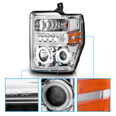 This Ford F350 Projector Headlights will fit 2008, 2009, 2010 Ford F350. Ford F350 Super Duty 2008-2010 Clear Projector with Headlights Halo and LED also features Diamond Cut Angel Eyes Design, Lower Power Consumption and Longer Lifetime, Dual Halo Rings, Ultra Bright Style LED, Quality Chrome Plated Housing, Amber Reflector, Low Beam H7, High Beam H1. Replace or upgrade your Ford F350 Projector Headlights with our Ford F350 Super Duty 2008-2010 Clear Projector with Headlights Halo and LED.