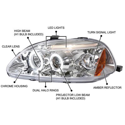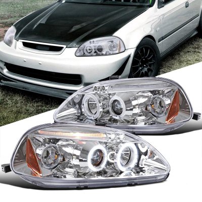 This Honda Civic Projector Headlights will fit 1996, 1997, 1998 Honda Civic. Honda Civic 1996-1998 Clear Dual Halo Projector Headlights with LED also features Diamond Cut Angel Eyes,Dual Halo Rings,Stylish LED Eyebrow,Quality Chrome Plated Housing,Amber Reflector. Replace or upgrade your Honda Civic Projector Headlights with our Honda Civic 1996-1998 Clear Dual Halo Projector Headlights with LED.