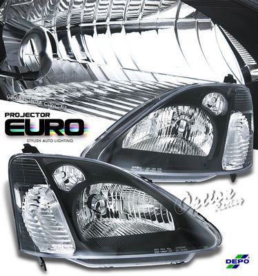 This Honda Civic Euro Headlights will fit 2002, 2003 Honda Civic. Replace or upgrade your Honda Civic Euro Headlights with our Honda Civic Hatchback 2002-2003 Depo JDM Black Euro Headlights.