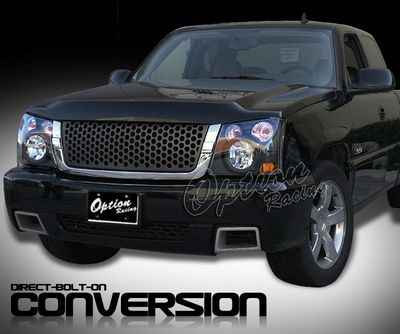 This Chevy Avalanche Grille and Headlight Conversion will fit 2003, 2004, 2005, 2006 Chevy Avalanche. Chevy Avalanche 2003-2006 Chrome Trim Black Round Hole Grille and Headlight Conversion Kit also features Black Denali Style Round Hole Mesh Grille with Chrome Trim,Black Housing Euro Headlights,Bolt On Installation,All In One Complete Conversion. Replace or upgrade your Chevy Avalanche Grille and Headlight Conversion with our Chevy Avalanche 2003-2006 Chrome Trim Black Round Hole Grille and Headlight Conversion Kit.