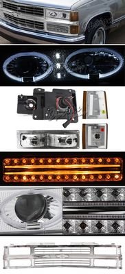 This Chevy 3500 Pickup Grille and Headlight Conversion will fit 1994, 1995, 1996, 1997, 1998, 1999, 2000 Chevy 3500 Pickup. Chevy 3500 Pickup 1994-2000 Chrome Grille and Halo Headlights with Bumper Lights also features Clear Dual Halo Projector Headlights with LED,LED Look Bumper Lights,Smoked Amber Corner Lights,Chrome Billet Grille Shell. Replace or upgrade your Chevy 3500 Pickup Grille and Headlight Conversion with our Chevy 3500 Pickup 1994-2000 Chrome Grille and Halo Headlights with Bumper Lights.