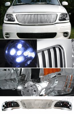 This Ford F150 Grille and Headlight Conversion will fit 1999, 2000, 2001, 2002, 2003 Ford F150. Replace or upgrade your Ford F150 Grille and Headlight Conversion with our Ford F150 1999-2003 Chrome Vertical Grille and Black Euro Headlights Set.
