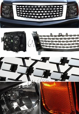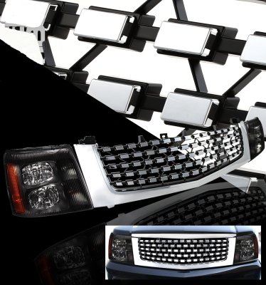 • Cadillac Escalade 2002 Chrome Mesh Grille and Black Euro Headlights Set