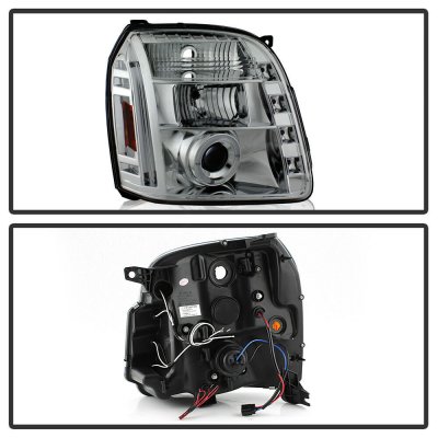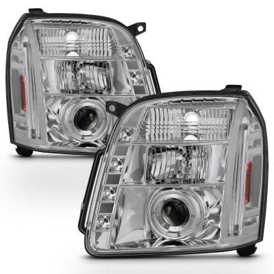 This GMC Yukon Denali Projector Headlights will fit 2007, 2008, 2009, 2010, 2011, 2012, 2013, 2014 GMC Yukon Denali. GMC Yukon Denali 2007-2014 Clear Halo Projector Headlights with LED also features H1 light bulbs included for high and low beams.. Replace or upgrade your GMC Yukon Denali Projector Headlights with our GMC Yukon Denali 2007-2014 Clear Halo Projector Headlights with LED.
