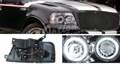 This Ford F150 Grille and Headlight Conversion will fit 2004, 2005, 2006, 2007, 2008 Ford F150. Ford F150 2004-2008 Black Mesh Grille and Clear CCFL Halo Projector Headlights also features Black Mesh Grille,Clear CCFL Dual Halo Projector Headlights. Replace or upgrade your Ford F150 Grille and Headlight Conversion with our Ford F150 2004-2008 Black Mesh Grille and Clear CCFL Halo Projector Headlights.