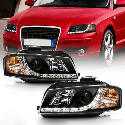 This Audi A3 Projector Headlights will fit 2006, 2007, 2008 Audi A3. Audi A3 2006-2008 Black Projector Headlights with LED Daytime Running Lights also features Projector Style Lighting,Direct Replacement,Easy Installation. Replace or upgrade your Audi A3 Projector Headlights with our Audi A3 2006-2008 Black Projector Headlights with LED Daytime Running Lights.