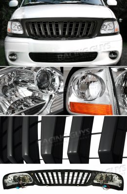 This Ford F150 Grille and Headlight Conversion will fit 1999, 2000, 2001, 2002, 2003 Ford F150. Ford F150 1999-2003 Black Vertical Grille and Clear Euro Headlights also features Black Vertical Grille,Depo Clear Euro Headlights. Replace or upgrade your Ford F150 Grille and Headlight Conversion with our Ford F150 1999-2003 Black Vertical Grille and Clear Euro Headlights.