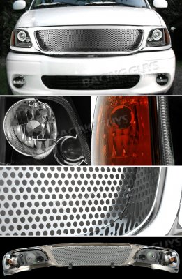 This Ford Expedition Grille and Headlight Conversion will fit 1999, 2000, 2001, 2002 Ford Expedition. Ford Expedition 1999-2002 Chrome Mesh Grille and Black Headlights also features Chrome Mesh Grille,Black Euro Headlights,Amber Corner Lights. Replace or upgrade your Ford Expedition Grille and Headlight Conversion with our Ford Expedition 1999-2002 Chrome Mesh Grille and Black Headlights.