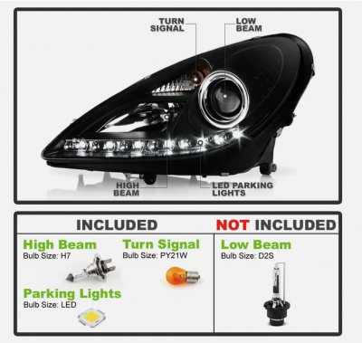 This Mercedes Benz SLK Projector Headlights will fit 2005, 2006, 2007, 2008, 2009, 2010, 2011 Mercedes Benz SLK. Mercedes Benz SLK 2005-2011 Black Projector Headlights with LED also features Black Housing Clear Lens, Low Beam re-use stock light bulb HID-D2S light bulb, High Beam H7. Replace or upgrade your Mercedes Benz SLK Projector Headlights with our Mercedes Benz SLK 2005-2011 Black Projector Headlights with LED.