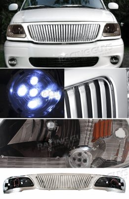 This Ford F150 Grille and Headlight Conversion will fit 1999, 2000, 2001, 2002, 2003 Ford F150. Ford F150 1999-2003 Chrome Vertical Grille and Smoked Headlights Set also features Chrome Vertical Grille,Smoked Euro Headlights with LED. Replace or upgrade your Ford F150 Grille and Headlight Conversion with our Ford F150 1999-2003 Chrome Vertical Grille and Smoked Headlights Set.