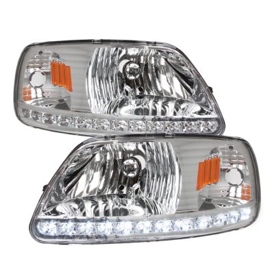 This Ford F150 Headlights Set will fit 1997, 1998, 1999, 2000, 2001, 2002, 2003 Ford F150. Ford F150 1997-2003 Clear LED DRL Headlights and LED Tail Lights Red also features LED Daytime Running Lights, Clean Modern One-Piece Design, Modern LED Tail Lights. Replace or upgrade your Ford F150 Headlights Set with our Ford F150 1997-2003 Clear LED DRL Headlights and LED Tail Lights Red.