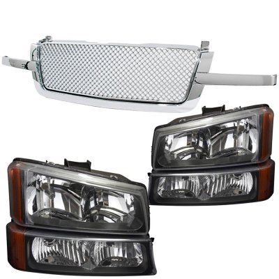 Chevy Silverado 2500 2003-2004 Chrome Mesh Grille and Black Headlights Set
