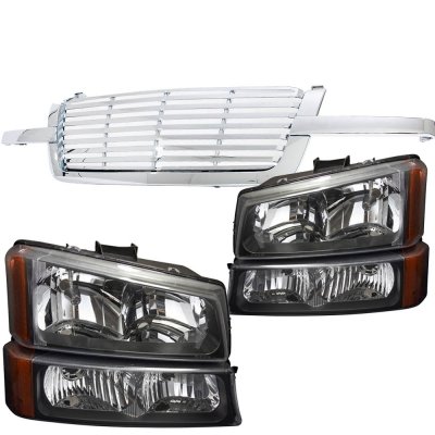 Chevy Silverado 1500HD 2003-2004 Chrome Billet Grille and Black Headlights Set