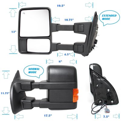 This Ford Excursion Towing Mirrors will fit 2003, 2004, 2005 Ford Excursion. Ford Excursion 2003-2005 Towing Mirrors Power Heated LED Signal Lights also features New 2008 Facelift Design!, Power Mirror Angle Adjustment, Heated Mirror, Manual Extend by Telescoping, Manual Folding, Closed Length: 17.5", Extended Length: 19.5". Replace or upgrade your Ford Excursion Towing Mirrors with our Ford Excursion 2003-2005 Towing Mirrors Power Heated LED Signal Lights.