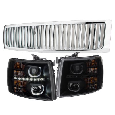 This Chevy Silverado Grille and Headlight Conversion will fit 2007, 2008, 2009, 2010, 2011, 2012, 2013 Chevy Silverado. Chevy Silverado 2007-2013 Chrome Vertical Grille Black Smoked Halo LED DRL Projector Headlights also features Chrome Vertical Grille,LED Daytime Running Lights, Black Housing Headlights Smoked Lens. Replace or upgrade your Chevy Silverado Grille and Headlight Conversion with our Chevy Silverado 2007-2013 Chrome Vertical Grille Black Smoked Halo LED DRL Projector Headlights.