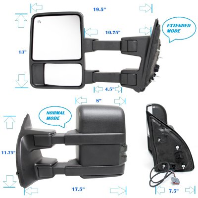 This Ford F450 Towing Mirrors will fit 2003, 2004, 2005, 2006, 2007 Ford F450. Ford F450 Cab Chassis 2003-2007 Towing Mirrors Power Heated Smoked LED Signal Lights also features New 2008 Facelift Design!, Built-in LED Turn Signal Lights, Power Mirror Angle Adjustment, Heated Mirror, Manual Extend by Telescoping, Manual Folding, Closed Length: 17.5", Extended Length: 19.5". Replace or upgrade your Ford F450 Towing Mirrors with our Ford F450 Cab Chassis 2003-2007 Towing Mirrors Power Heated Smoked LED Signal Lights.