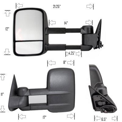 This GMC Sierra 2500 Towing Mirrors will fit 1988, 1989, 1990, 1991, 1992, 1993, 1994, 1995, 1996, 1997, 1998 GMC Sierra 2500. GMC Sierra 2500 1988-1998 Power Towing Mirrors LED Arrow Signal Lights also features Built-in LED Arrow Turn Signal Lights,Signal Lights Wiring Required,Power Mirror Angle Adjustment,Manual Extend by Telescoping,Manual Folding. Replace or upgrade your GMC Sierra 2500 Towing Mirrors with our GMC Sierra 2500 1988-1998 Power Towing Mirrors LED Arrow Signal Lights.