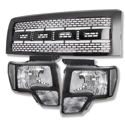 Ford F150 2009-2014 Black Raptor Style Grille and Black Euro Headlights