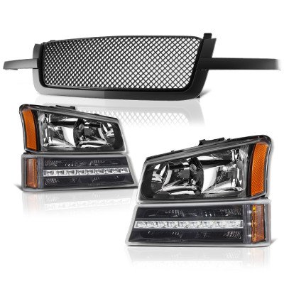 Chevy Silverado 2500 2003-2004 Black Mesh Grille and Headlights LED DRL Bumper Lights