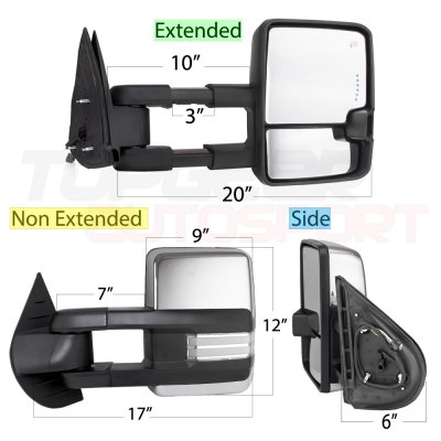 This GMC Sierra 3500HD Towing Mirrors will fit 2007, 2008, 2009, 2010, 2011, 2012, 2013, 2014 GMC Sierra 3500HD. GMC Sierra 3500HD 2007-2014 Chrome Towing Mirrors Clear LED DRL Power Heated also features 2015 Facelift Style Towing Mirrors, Chrome Mirror Caps, Power Mirror Angle Adjustment, Heated Mirror, LED Daytime Running Lights, Integrated LED Turn Signal Lights, LED Rear Guidance Lamps (Wiring Required), Manual Extension, Manual Folding. Replace or upgrade your GMC Sierra 3500HD Towing Mirrors with our GMC Sierra 3500HD 2007-2014 Chrome Towing Mirrors Clear LED DRL Power Heated.