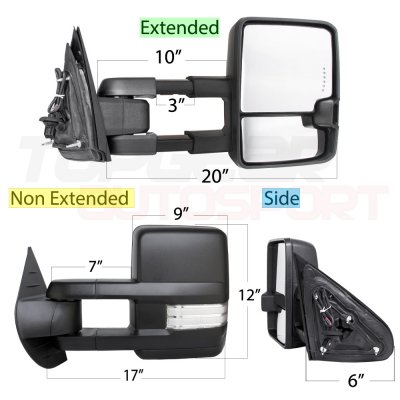 This GMC Sierra Towing Mirrors will fit 2014, 2015, 2016, 2017, 2018 GMC Sierra. GMC Sierra 2014-2018 Towing Mirrors Clear LED DRL Power Heated also features Power Mirror Angle Adjustment, Heated Mirror, LED Daytime Running Lights, Integrated LED Turn Signal Lights, LED Rear Guidance Lamps (Wiring Required), Manual Extension, Manual Folding. Replace or upgrade your GMC Sierra Towing Mirrors with our GMC Sierra 2014-2018 Towing Mirrors Clear LED DRL Power Heated.