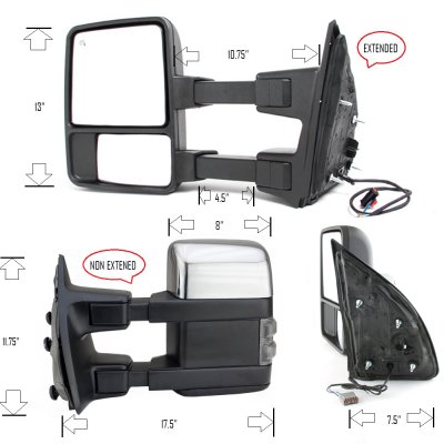 This Ford Excursion Towing Mirrors will fit 2000, 2001, 2002 Ford Excursion. Ford Excursion 2000-2002 Chrome Towing Mirrors Power Heated LED Signal Lights also features Chrome Top Plated Cover, Built-in LED Turn Signal Lights, Power Mirror Angle Adjustment, Heated Mirror, Manual Extend by Telescoping, Manual Folding. Replace or upgrade your Ford Excursion Towing Mirrors with our Ford Excursion 2000-2002 Chrome Towing Mirrors Power Heated LED Signal Lights.