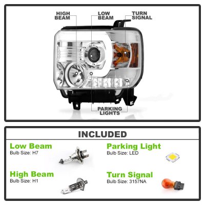 This GMC Sierra 2500HD Projector Headlights will fit 2015, 2016, 2017, 2018, 2019 GMC Sierra 2500HD. GMC Sierra 2015-2018 2500HD LED Signature DRL Projector Headlights also features Low Beam H7, High Beam H1. Replace or upgrade your GMC Sierra 2500HD Projector Headlights with our GMC Sierra 2015-2018 2500HD LED Signature DRL Projector Headlights.