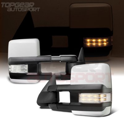 This GMC Sierra 3500 Towing Mirrors will fit 2003, 2004, 2005, 2006 GMC Sierra 3500. GMC Sierra 3500 2003-2006 White Towing Mirrors Clear LED Lights Power Heated also features 2015 Facelift Style Towing Mirrors, White Painted Cover, White Color Code: WA8624, Power Mirror Angle Adjustment, Heated Mirror, Integrated LED Turn Signal Lights, LED Rear Guidance Lamps (Wiring Required), Manual Extend by Telescoping, Manual Folding. Replace or upgrade your GMC Sierra 3500 Towing Mirrors with our GMC Sierra 3500 2003-2006 White Towing Mirrors Clear LED Lights Power Heated.