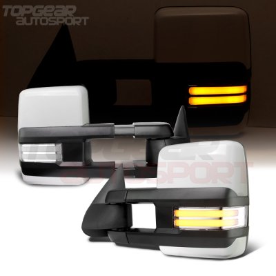 This GMC Sierra 3500 Towing Mirrors will fit 2003, 2004, 2005, 2006 GMC Sierra 3500. GMC Sierra 3500 2003-2006 White Towing Mirrors Clear LED DRL Power Heated also features 2015 Facelift Style Towing Mirrors, White Painted Cover, White Color Code: WA8624, Power Mirror Angle Adjustment, Heated Mirror, Integrated LED Turn Signal Lights, LED Rear Guidance Lamps (Wiring Required), Manual Extend by Telescoping, Manual Folding. Replace or upgrade your GMC Sierra 3500 Towing Mirrors with our GMC Sierra 3500 2003-2006 White Towing Mirrors Clear LED DRL Power Heated.