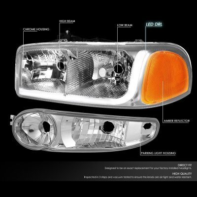 This GMC Sierra Denali Euro Headlights will fit 2002, 2003, 2004, 2005, 2006 GMC Sierra Denali. Replace or upgrade your GMC Sierra Denali Euro Headlights with our GMC Sierra Denali 2002-2006 Headlights Tube DRL.