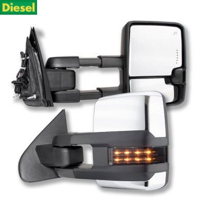 This GMC Sierra 3500HD Towing Mirrors will fit 2015, 2016, 2017, 2018, 2019 GMC Sierra 3500HD. GMC Sierra 3500HD Diesel 2015-2019 Chrome Towing Mirrors Smoked LED Lights Power Heated also features Chrome Mirror Caps, Power Mirror Angle Adjustment, Heated Mirror, LED Clearance Running Lights, Integrated LED Turn Signal Lights, LED Rear Guidance Lamps (Wiring Required), Include Temperature Sensor, Manual Extension, Manual Folding. Replace or upgrade your GMC Sierra 3500HD Towing Mirrors with our GMC Sierra 3500HD Diesel 2015-2019 Chrome Towing Mirrors Smoked LED Lights Power Heated.