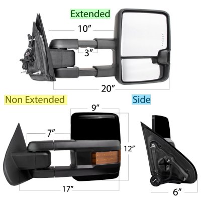 This Chevy Silverado 2500HD Towing Mirrors will fit 2015, 2016, 2017, 2018, 2019 Chevy Silverado 2500HD. Chevy Silverado 2500HD 2015-2019 Glossy Black Power Folding Towing Mirrors LED Lights Heated also features Glossy Black Mirror Cap, Power Mirror Angle Adjustment, Heated Mirror, Integrated LED Turn Signal Lights, LED Rear Guidance Lamps (Wiring Required), Include Temperature Sensor, Manual Extension, Power Folding. Replace or upgrade your Chevy Silverado 2500HD Towing Mirrors with our Chevy Silverado 2500HD 2015-2019 Glossy Black Power Folding Towing Mirrors LED Lights Heated.