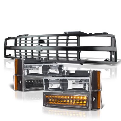 Chevy 1500 Pickup 1988-1993 Black Grille Headlights LED Bumper Lights
