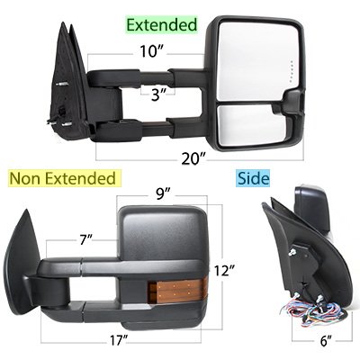This Chevy Colorado Towing Mirrors will fit 2015, 2016, 2017, 2018, 2019 Chevy Colorado. Chevy Colorado 2015-2019 Towing Mirrors LED Lights Power Heated also features Power Mirror Angle Adjustment, Heated Mirror, Integrated LED Turn Signal Lights, LED Rear Guidance Lamps (Wiring Required), Manual Extend by Telescoping, Manual Folding. Replace or upgrade your Chevy Colorado Towing Mirrors with our Chevy Colorado 2015-2019 Towing Mirrors LED Lights Power Heated.