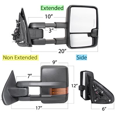 This Chevy Silverado 3500 Towing Mirrors will fit 2001, 2002 Chevy Silverado 3500. Chevy Silverado 3500 2001-2002 Power Folding Towing Mirrors LED Lights also features Convert Manual-Folding to Power-Folding, Power Mirror Angle Adjustment, Heated Mirror, Integrated LED Turn Signal Lights, LED Clearance Running Lights, LED Rear Guidance Lamps (Wiring Required), Manual Extension, Power Folding with Remote (Wiring Required). Replace or upgrade your Chevy Silverado 3500 Towing Mirrors with our Chevy Silverado 3500 2001-2002 Power Folding Towing Mirrors LED Lights.