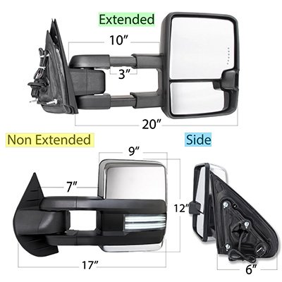 This GMC Yukon XL Denali Towing Mirrors will fit 2007, 2008, 2009, 2010, 2011, 2012, 2013, 2014 GMC Yukon XL Denali. GMC Yukon XL Denali 2007-2014 Chrome Tow Mirrors Switchback LED DRL Sequential Signal also features Switchback LED Lights Function, Bright White LED Daytime Running Lights, Sequential Amber Signal Lights, Power Mirror Angle Adjustment, Heated Mirror, Integrated LED Turn Signal Lights, LED Rear Guidance Lamps (Wiring Required), Manual Extend by Telescoping, Manual Folding. Replace or upgrade your GMC Yukon XL Denali Towing Mirrors with our GMC Yukon XL Denali 2007-2014 Chrome Tow Mirrors Switchback LED DRL Sequential Signal.