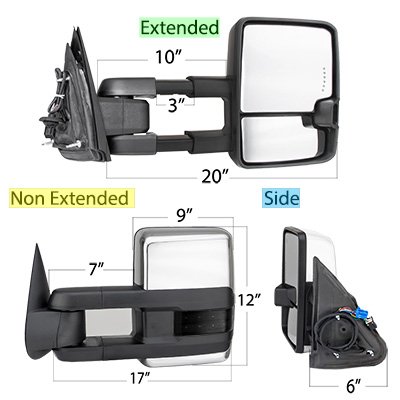 This Chevy Silverado 3500 Towing Mirrors will fit 2001, 2002 Chevy Silverado 3500. Chevy Silverado 3500 2001-2002 Chrome Power Folding Towing Mirrors Smoked LED Lights also features Convert Manual-Folding to Power-Folding, Chrome Mirror Caps, Power Mirror Angle Adjustment, Heated Mirror, Integrated LED Turn Signal Lights, LED Clearance Running Lights, LED Rear Guidance Lamps (Wiring Required), Manual Extension, Power Folding with Remote (Wiring Required). Replace or upgrade your Chevy Silverado 3500 Towing Mirrors with our Chevy Silverado 3500 2001-2002 Chrome Power Folding Towing Mirrors Smoked LED Lights.
