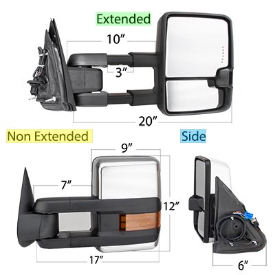 This Chevy Avalanche Towing Mirrors will fit 2002 Chevy Avalanche. 2002 Chevy Avalanche Chrome Power Folding Towing Mirrors LED Lights also features Convert Manual-Folding to Power-Folding, Chrome Mirror Caps, Power Mirror Angle Adjustment, Heated Mirror, LED Clearance Running Lights, Integrated LED Turn Signal Lights, LED Rear Guidance Lamps (Wiring Required), Manual Extension, Power Folding with Remote (Wiring Required). Replace or upgrade your Chevy Avalanche Towing Mirrors with our 2002 Chevy Avalanche Chrome Power Folding Towing Mirrors LED Lights.
