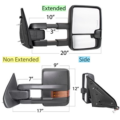 This Dodge Ram 3500 Towing Mirrors will fit 2003, 2004, 2005, 2006, 2007, 2008, 2009 Dodge Ram 3500. Dodge Ram 3500 2003-2009 Tow Mirrors LED Lights Power Heated also features Power Mirror Angle Adjustment, Heated Mirror, LED Running Lights, Integrated LED Turn Signal Lights, LED Rear Guidance Lamps (Wiring Required), LED Puddle Lights, Manual Extension, Manual Folding. Replace or upgrade your Dodge Ram 3500 Towing Mirrors with our Dodge Ram 3500 2003-2009 Tow Mirrors LED Lights Power Heated.
