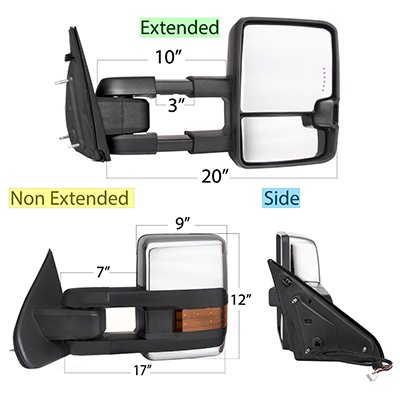 This Dodge Ram Towing Mirrors will fit 2009, 2010, 2011, 2012, 2013, 2014, 2015, 2016, 2017, 2018 Dodge Ram. Dodge Ram 1500 2009-2018 Chrome Power Fold Tow Mirrors LED Lights also features Power Mirror Angle Adjustment, Heated Mirror, LED Running Lights, Integrated LED Turn Signal Lights, LED Rear Guidance Lamps (Wiring Required), LED Puddle Lights, Include Temperature Sensor, Manual Extension, Power Folding. Replace or upgrade your Dodge Ram Towing Mirrors with our Dodge Ram 1500 2009-2018 Chrome Power Fold Tow Mirrors LED Lights.