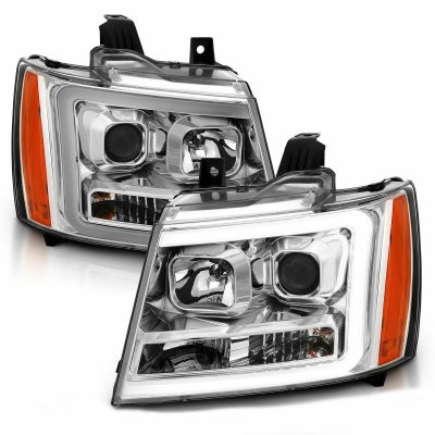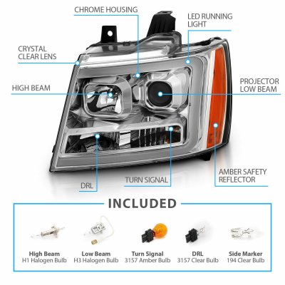 This Chevy Tahoe Projector Headlights will fit 2007, 2008, 2009, 2010, 2011, 2012, 2013, 2014 Chevy Tahoe. Chevy Tahoe 2007-2014 DRL Projector Headlights LED DRL Dynamic Signal also features White LED Daytime Running Lights, Switchback Amber Turn Signals, Low Beam H3, High Beam H1. Replace or upgrade your Chevy Tahoe Projector Headlights with our Chevy Tahoe 2007-2014 DRL Projector Headlights LED DRL Dynamic Signal.
