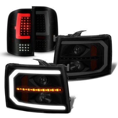 Chevy Silverado 3500HD 2007-2014 Black Smoked LED DRL Projector Headlights LED Tail Lights
