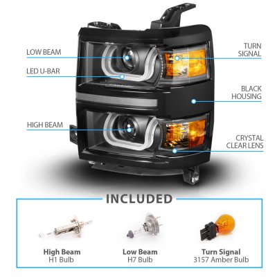 This Chevy Silverado Projector Headlights will fit 2014, 2015 Chevy Silverado. Chevy Silverado 1500 2014-2015 Black Projector Headlights LED U-Bar also features Projector Style Lighting,Direct Replacement,Easy Installation. Replace or upgrade your Chevy Silverado Projector Headlights with our Chevy Silverado 1500 2014-2015 Black Projector Headlights LED U-Bar.