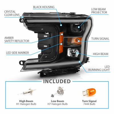 This Ford F150 Projector Headlights will fit 2018, 2019, 2020 Ford F150. Ford F150 2018-2020 Black Projector Headlights LED DRL Side Marker also features Projector Style Lighting,Direct Replacement,Easy Installation. Replace or upgrade your Ford F150 Projector Headlights with our Ford F150 2018-2020 Black Projector Headlights LED DRL Side Marker.