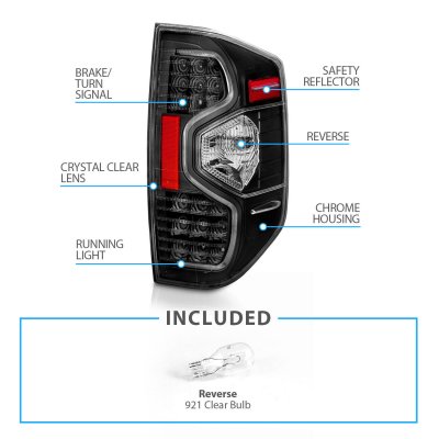 This Toyota Tundra LED Tail Lights will fit 2014, 2015, 2016, 2017, 2018, 2019, 2020, 2021 Toyota Tundra. Replace or upgrade your Toyota Tundra LED Tail Lights with our Toyota Tundra 2014-2021 Black LED Tail Lights.